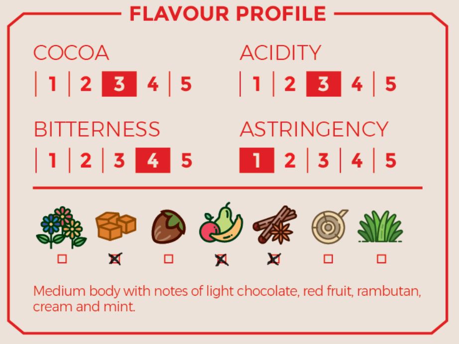Corps moyen avec des notes de chocolat léger, de fruits rouges, de ramboutan, de crème et de menthe.